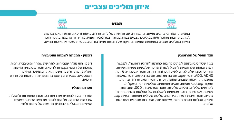 מהדריך "מאזן המוליכים" ינחה אותך איך לאזן את הסרוטונין והדופמין במוח באופן מדויק מאוד ומבוסס מחקרים, באמצעות איזון חומצות אמינו ושימוש בקו-פקטורים לייצור המוליכים.